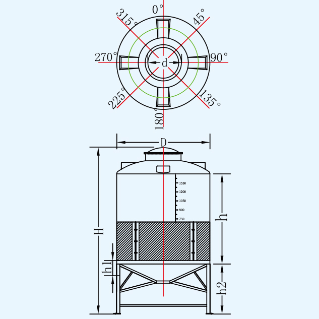 名稱 型號 容量L 桶體直徑D 人孔d 含腳總高度H 垂高h(yuǎn) 錐高h(yuǎn)1 腳高h(yuǎn)2 平均厚度mm