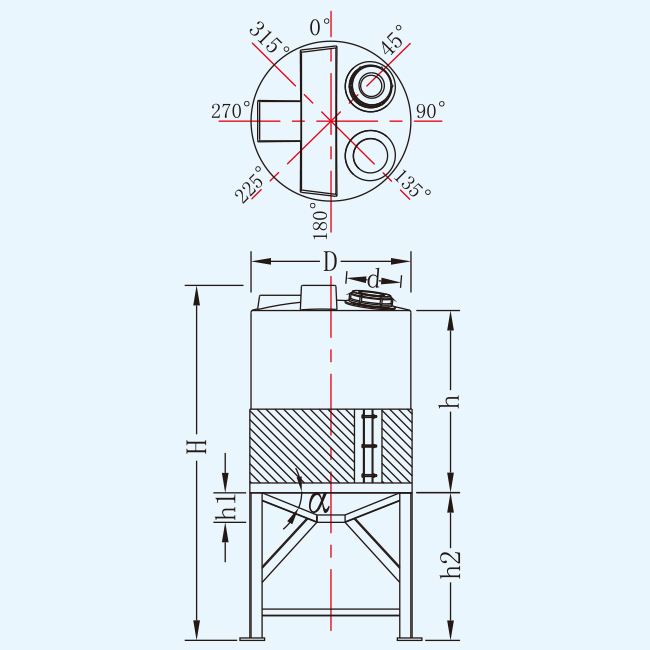名稱 | 型號 | 容量L | 桶體直徑D | 人孔直徑d | 含腳總高H | 垂高h(yuǎn) | 錐高h(yuǎn)2 | 腳高h(yuǎn)1 | 平均厚度mm |