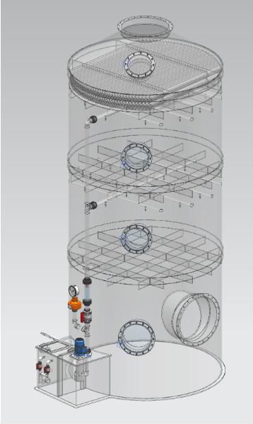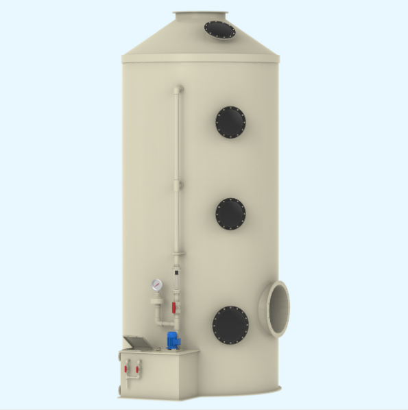 結(jié)構及工作原理:是將酸(堿)霧廢氣由風管引入噴淋塔,經(jīng)過填料層,廢氣與堿(酸)性吸收液進行氣液兩相充分接觸吸收中和反應,酸(堿)霧廢氣經(jīng)過凈化后,再經(jīng)除霧板脫水除霧后由風機排入大氣。吸收液在塔底經(jīng)水泵增壓后在塔頂噴淋而下,最后回流至塔底循環(huán)使用!