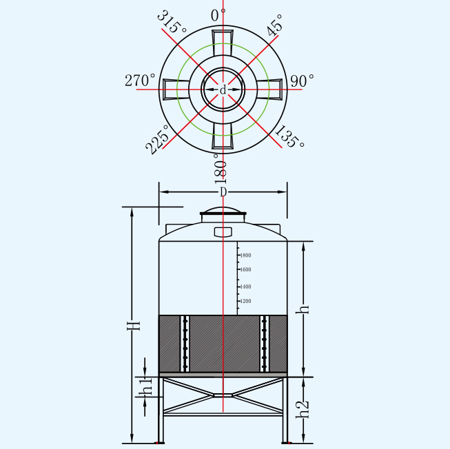 名稱 型號 容量L 桶體直徑D 人孔d 含腳總高度H 垂高h 錐高h1 腳高h2 平均厚度mm