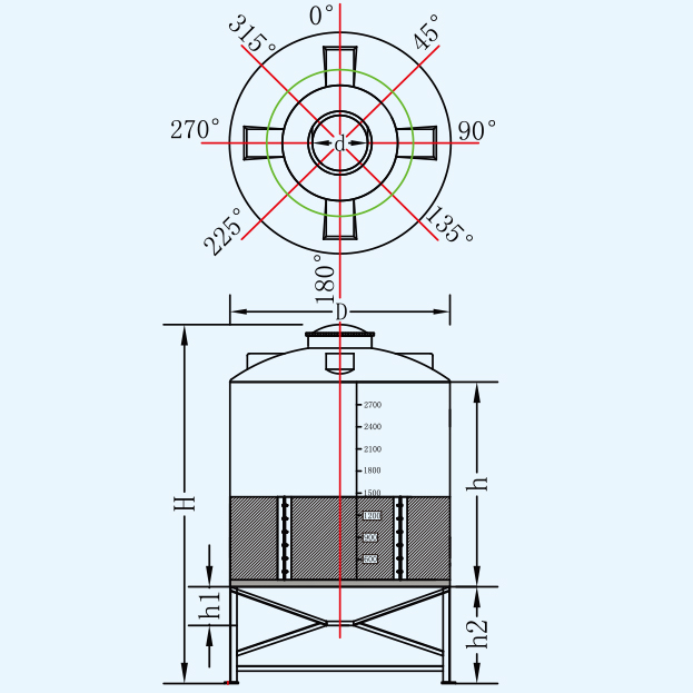 名稱 | 型號(hào) | 容量L | 桶體直徑D | 人孔直徑d | 含腳總高度H | 垂高h(yuǎn) | 錐高h(yuǎn)1 | 腳高h(yuǎn)2 | 平均厚度mm |