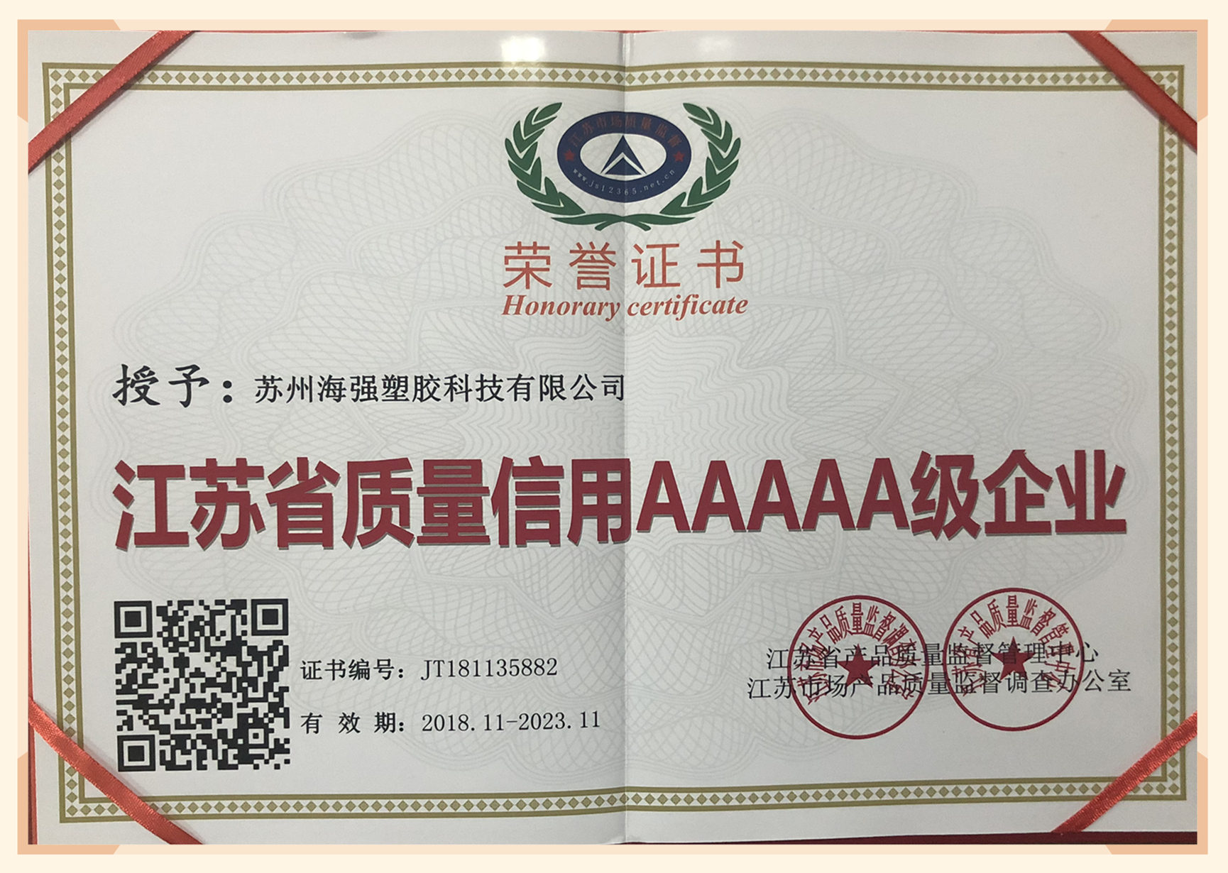 蘇州海強(qiáng)塑膠科技有限公司-被授予江蘇省質(zhì)量監(jiān)督局授予5A級企業(yè)